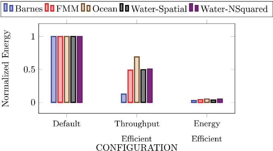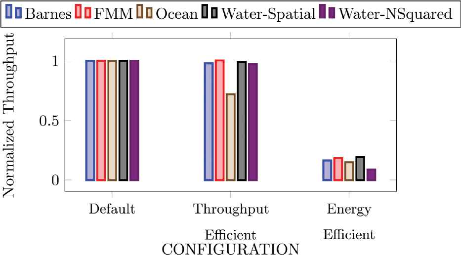 Results for normalized throughput and energy are shown in Figures 4 and 5 respectively. The figures clearly show that the default configuration has maximum throughput and at the same time maximum energy consumption. Throughput efficient configuration has reduced throughput and it also has reduced energy consumption. The minimum throughput is observed for Ocean benchmark i.e. 75% of the default value (see Figure 4). Whereas for all other applications less than 5% throughput reduction. The throughput efficient configuration shows decrease in energy consumption for all the applications (see Figure 5). Barnes application has shown least energy consumption i.e. around 10% of the default configuration. Whereas Ocean shows energy savings of up to 40% and for all other applications it is around 50%. The energy efficient configuration showed throughput reduction of more than 90% for all applications that is not desirable for most cases however this has resulted in highest energy savings of 90% or more (see Figures 4 and 5). Thus, results show that the throughput efficient configuration has desirable improvements in terms of both throughput and energy consumption.