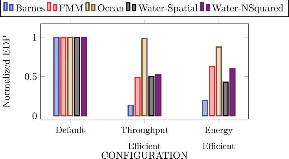 Figure 6 shows the normalized Energy Delay Product (EDP) of the three configurations. The figure shows that the EDP of throughput efficient configuration is 53% of the default value and of energy efficient configurations 55% of the default value on average (see Figure 6). The minimum EDP is observed for Barnes application for throughput efficient configuration i.e. 13% of the default value. For this configuration, FMM, Water Spatial and Water-NSquared show about 50% reduction in EDP. For energy efficient configuration, Barnes achieves 19% EDP and FMM, Ocean, Water Spatial and Water-NSquared achieve about 65% of the default EDP. Overall EDP is reduced significantly in all applications except Ocean application which improved least with 98% and 87% of the default EDPs for throughput efficient and energy efficient configurations respectively.