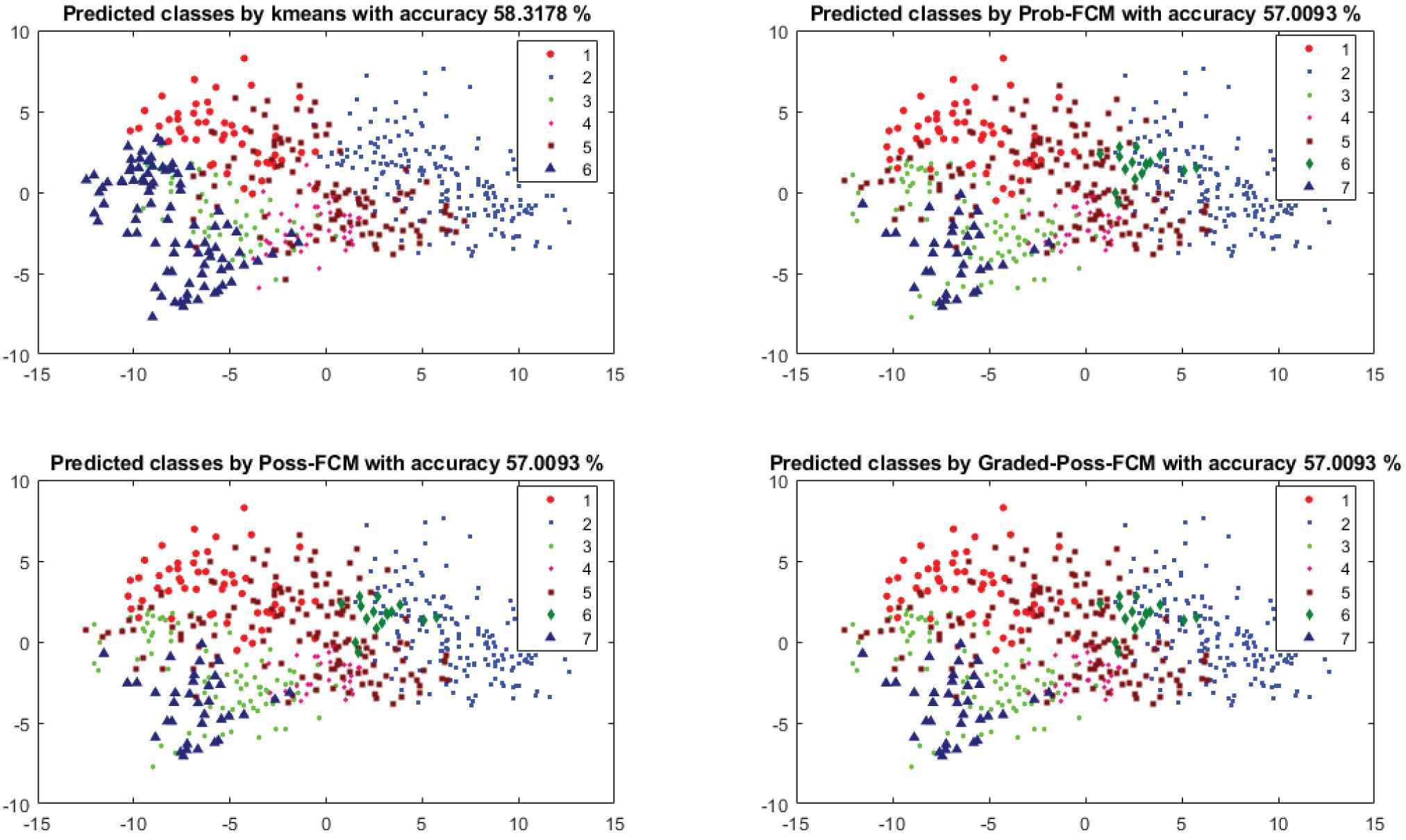 However, thanks to feature embedding and then feature selection, and to a good choice of the possibilistic and graded-possibilistic models parameters, i.e., α and β, the fuzzy clustering methods provide as good rate as the crisp clustering (cf. Figure 6). Besides, using a number of clusters greater than that of classes helps increasing performance (cf. Table 5). However, the number of clusters should not be too big.