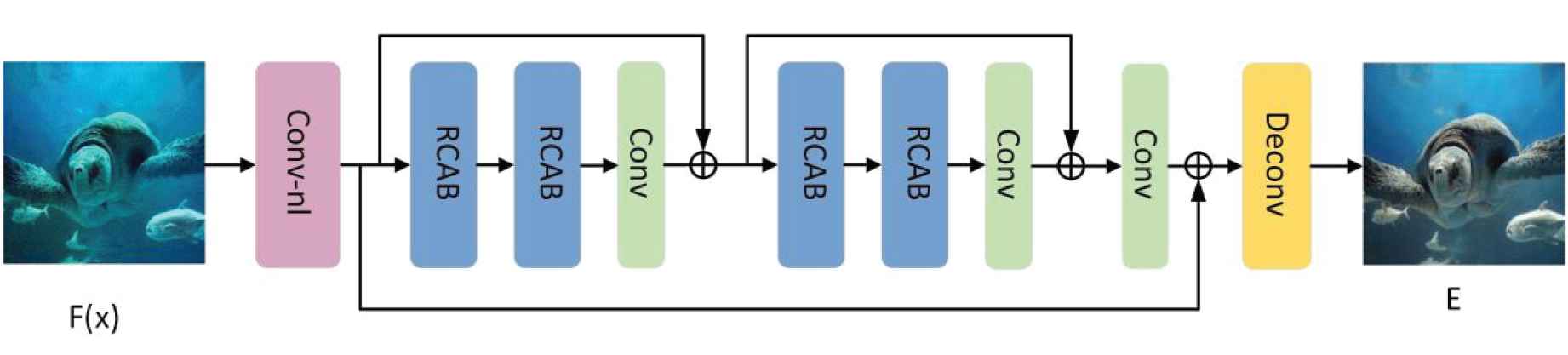 As a kind of typical methods of data-driven techniques, underwater image enhancement methods based on deep learning can fully learning parameters of model or target function through huge amount of data. Some researchers have attempted to utilize the deep learning techniques to the underwater image enhancement. For example, Li et al. [10] used GAN to estimate clear image through a large number of training image data sets and some underwater depth data as an end-to-end input, so as to restore image features and enhance visual effect. Zhu et al. [11] introduced a notion of image translation to generate two training sets, and peer sub-networks can learn self-style and transfer by adversarial loss each other. It got obvious visual color restoration effect but still owned some deficiencies in geometry restoration effect. Islam et al. [12] introduced many factors, i.e., image content, color and texture details to design target function of network. However, abovementioned methods usually only consider one degradation factor, we are unable to observe a deep learning method for underwater image enhancement which take into account many kinds of underwater degradation factors. Meanwhile, the phenomenon of gradient disappearing and exploding often appears in networks for underwater image enhancement, which limits the training performance.