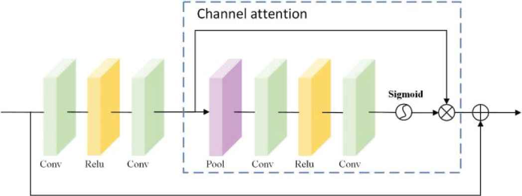 Figure 3 shows a basic architecture of our RTFAN, includes three parts, i.e., shallow feature de-noising module, deep feature enhancement module and reconstruction module. In shallow feature de-noising module, there are one convolution layer and one nonlocal de-noising module named Conv_nl, respectively. The nonlocal de-noising module can suppress noise and extract feature. The deep feature enhancement module is to further mine the image details, and it consists of four residual CA blocks (RCAB), one convolution layer and one long skip connection, detailed RCAB structure is shown in Figure 4 [19]. In RCAB, there are two Conv layers, a Relu activation layer and a CA module, which is introduced in section 3.4.2. Following the structure of RCAB, there is a deconvolutional layer to reconstruct the image.
