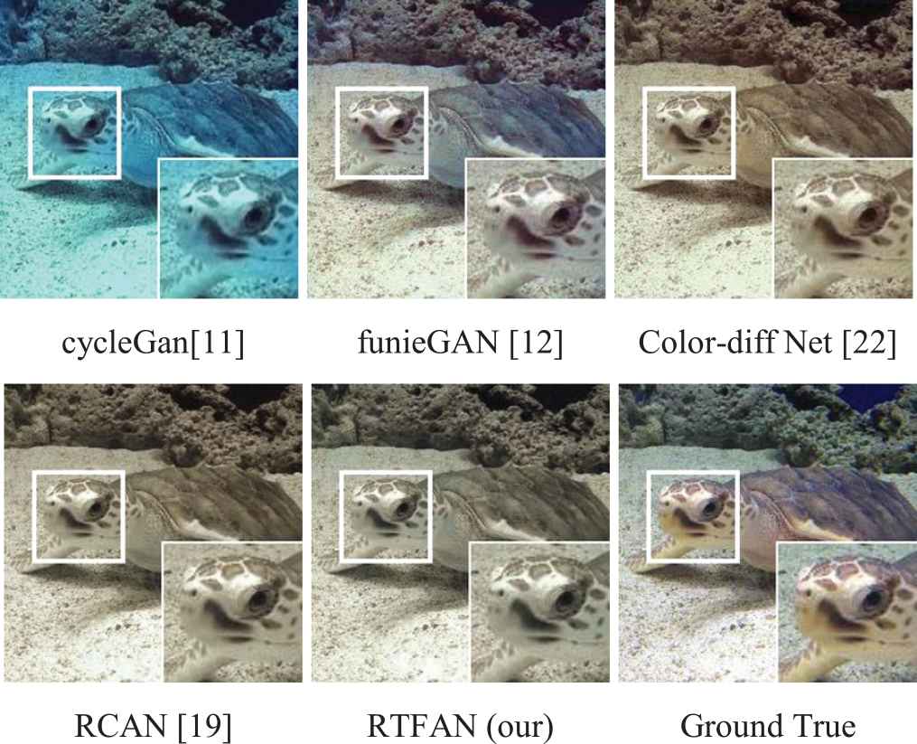 The enhanced result images: (a) input, (b) cycleGan, (c) funieGAN, (d) Color-diff Net, (e) RCAN, (f) residual two-fold attention network (RTFAN) and (g) ground truth.