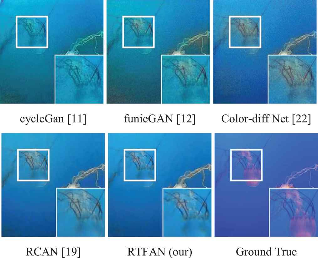 Next, we use four underwater image enhancement models based on deep learning to make a qualitative comparison with our RTFAN model: (1) cycleGan [11], (2) funieGAN [12], (3)Color-diff Net [22] (our previously completed work), (4) RCAN [19]. We use the same noise data set for training on these models, and the test results are amplified, as shown in Figures 8–10.