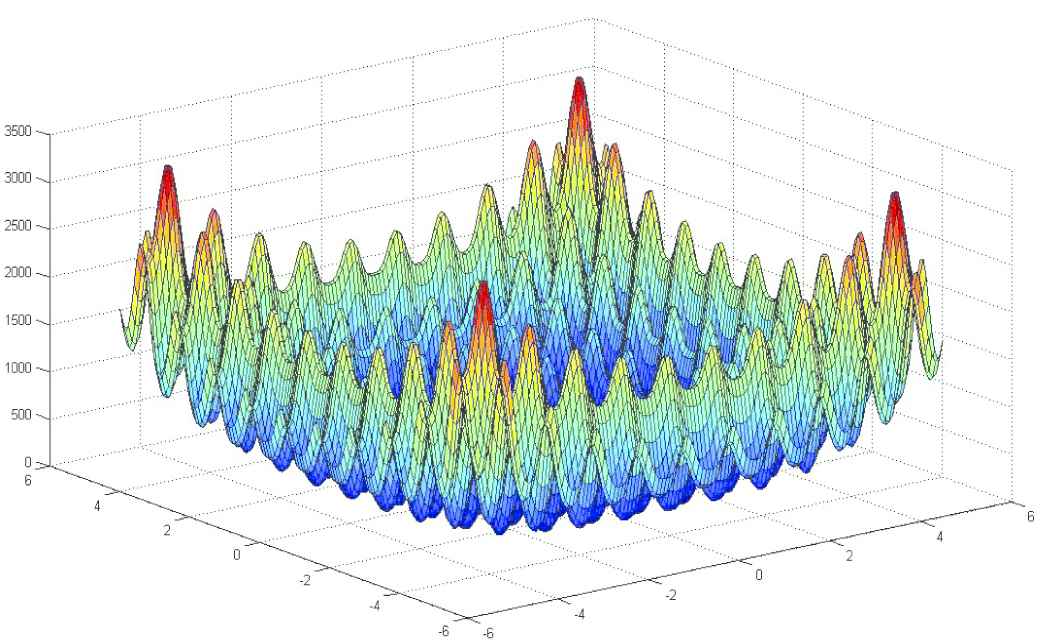 The target search problem can be defined as Swarm UAVs with the ability of target information perception enter the unknown environment within the known range to search the target. In the search process, UAV is required to allocate search resources reasonably, determine the best search area online and determine the target location. Therefore, the target search simulation experiment is designed. The experimental environments are mainly constructed by the multimodal benchmark functions. This kind of functions usually has many local extremum points and it is not easy to find the global extremum point for most swarm intelligence algorithms in few iterations. A list of selected typical benchmark functions is provided in Table 1. The functions are marked as F6 to F10 from top to bottom. In the experiment, we set the global optimal extremum as the goal. The contour map of the function can be easily connected with the real target search environment, such as topographic map or pollutant concentration, and the target point can represent the lowest altitude or pollution source correspondingly. Swarm UAVs can move freely in the environment and is abstracted as a group of points.