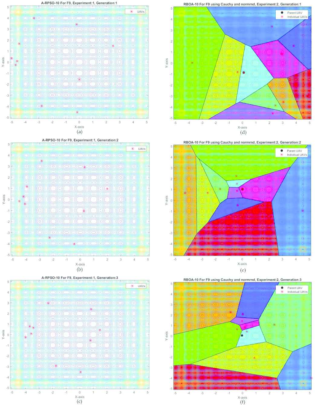 In Figure 5, the subfigures (a), (b), and (c) are the search states of the first generation, the second generation, and the third generation of A-RPSO-10, respectively. The subfigures (d), (e), and (f) are the search states of the first generation, the second generation, and the third generation of CRBOA-10, respectively.