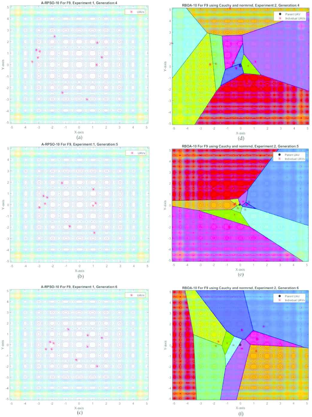 In Figure 6, the subfigures (a), (b), and (c) are the search states of the fourth generation, the fifth generation, and the sixth generation of A-RPSO-10, respectively. The subfigures (d), (e), and (f) are the search states of the fourth generation, the fifth generation, and the sixth generation of CRBOA-10, respectively.