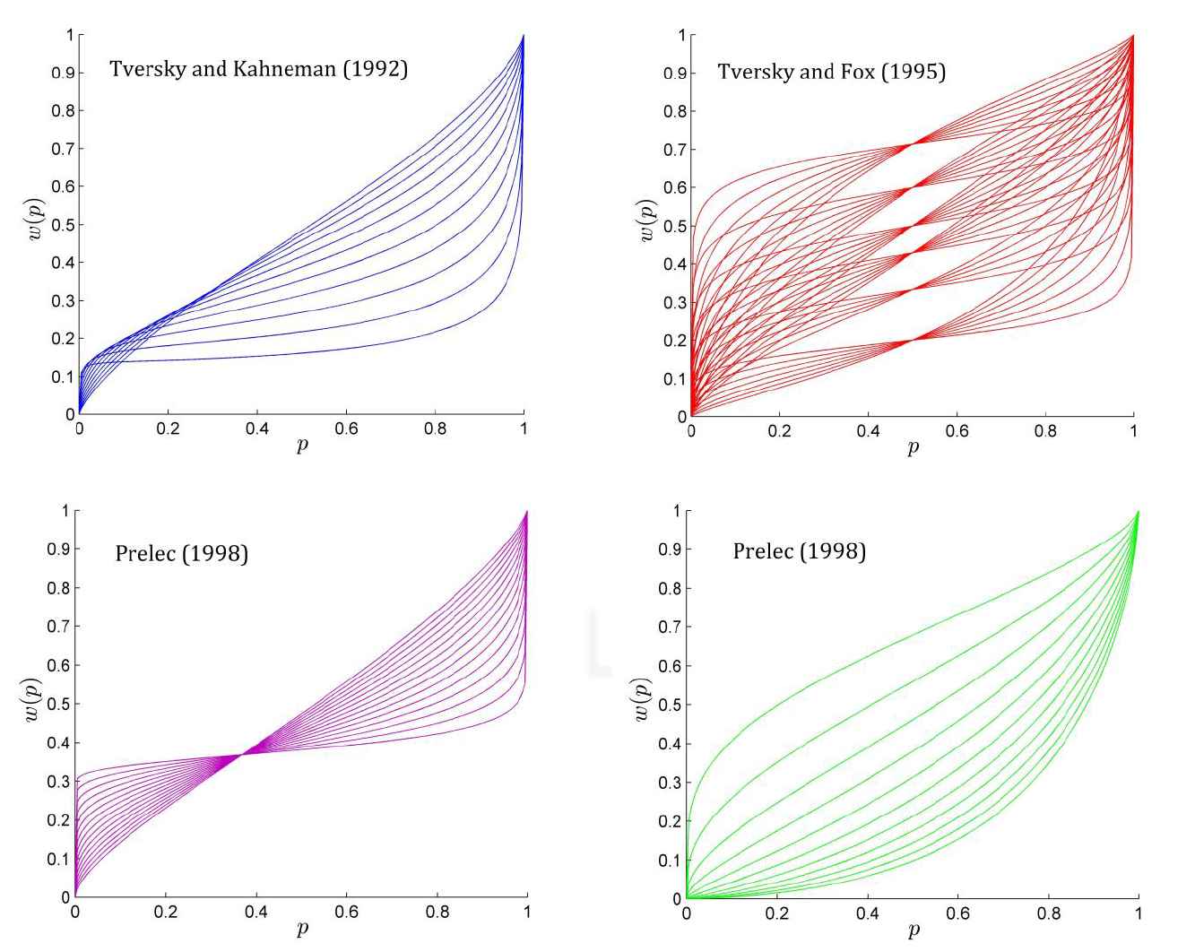 Ref. [5] first offered a hypothesis to establish a psychological foundation for the PWF. Based on the weighting function of Ref. [5], Ref. [26] proposed the first axiomatically derived weighting function. Then, Ref. [27] put forward a simpler derivation of Prelec's function. Ref. [28] provided a further simplification derivation of Prelec's PWF. Ref. [29] showed that the Tversky-Kahneman PWF is not increasing for all parameter values and therefore can assign negative decision weighting to some outcomes. Ref. [30] outlined three stylized facts on nonlinear weighting that any alternative theory of risk must address. Ref. [31] utilized psychophysical theory for deriving the Prelec's PWF from psychophysical laws of perceived waiting time in probabilistic choices to study the PWF.