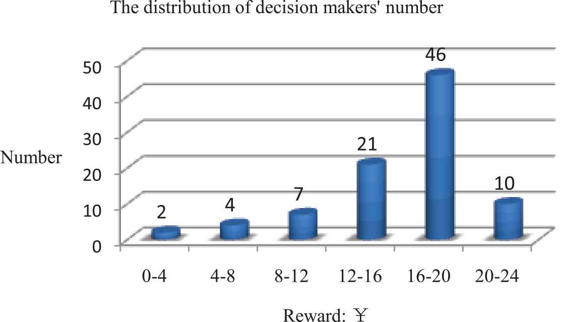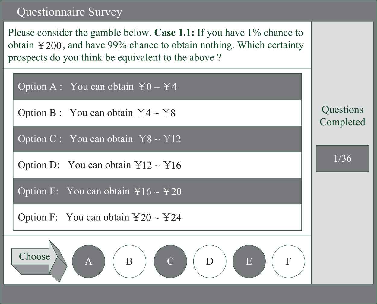 Note: The decision data about 90 graduate students are displayed, (Ұ200,p;0,1p) is a two-outcome prospect. The first column and second column on the left are respectively the choice questions and the probabilities of outcomes. Value represents the probability corresponding to the range of certainty prospects, q is the number of decision-makers choosing corresponding to the range of certainty prospect (i.e., in question 1.1, there are 10 graduate students, they think that Ұ200,0.01;0,0.99 is equivalent to the certainty prospect in the range of between Ұ20 and Ұ24), the values of 20c<24 in the last column of the upper right corner.