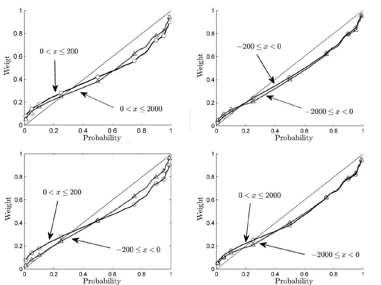 In Definition 1, the properties of PWF are redefined, such as fourfold patterns of risk preferences (properties (2) and (3)), risk-aversion (property (4)), and reference point (property (5)). To explain how the novel PWF model satisfy these properties, the following four cases are compared. Firstly, when the monetary rewards are gains, for small probabilities, decision-makers are more risk-averse at larger levels' monetary rewards (i.e., 0<x2000) than at smaller levels' monetary rewards (i.e., 0<x200); for big probabilities, decision-makers are more risk-seeking at larger levels' monetary rewards (i.e., 0<x2000) than at smaller levels' monetary rewards (i.e., 0<x200), which are displayed on the upper left panel of Figure 8. Secondly, when the monetary rewards are losses, risk preference reverse, the upper right panel of Figure 4 shows the properties. Thirdly, when monetary rewards' levels are same such as |x|200, decision-makers are more risk-averse for small probabilities' losses than for small probabilities' gains and more risk-seeking for big probabilities' losses than for big probabilities' gains (the PWF departs more from the diagonal line for gains than for losses in same monetary rewards' levels), which are displayed on the lower left panel of Figure 8. Lastly, the risk attitudes of decision-makers under the case of |x|2000 are similar to under the case of |x|200, the lower right panel of Figure 8 reveals the characteristics. Figure 8 shows that, both for low levels' monetary rewards and for high levels' monetary rewards or for gains and for losses, decision-makers overweight small probabilities, and underweight moderate and big probabilities (the four charts in Figure 8 both display that the PWF curves are above the diagonal for small probabilities and under the diagonal for moderate and big probabilities). Figure 8 also shows that, for small probabilities' gains, the risk-seeking of decision-makers in high levels' monetary rewards is more than in low levels' monetary rewards; for big probabilities' gains, the risk-aversion of decision-makers in high levels' monetary rewards is less than in low levels' monetary rewards; for losses, the preferences reversal phenomenon happens.