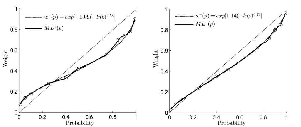 The objective probability p corresponds to subjective probability w(p) with different expression forms of the preference curves. The dotted lines correspond to the 95% confidence interval across the preference points.