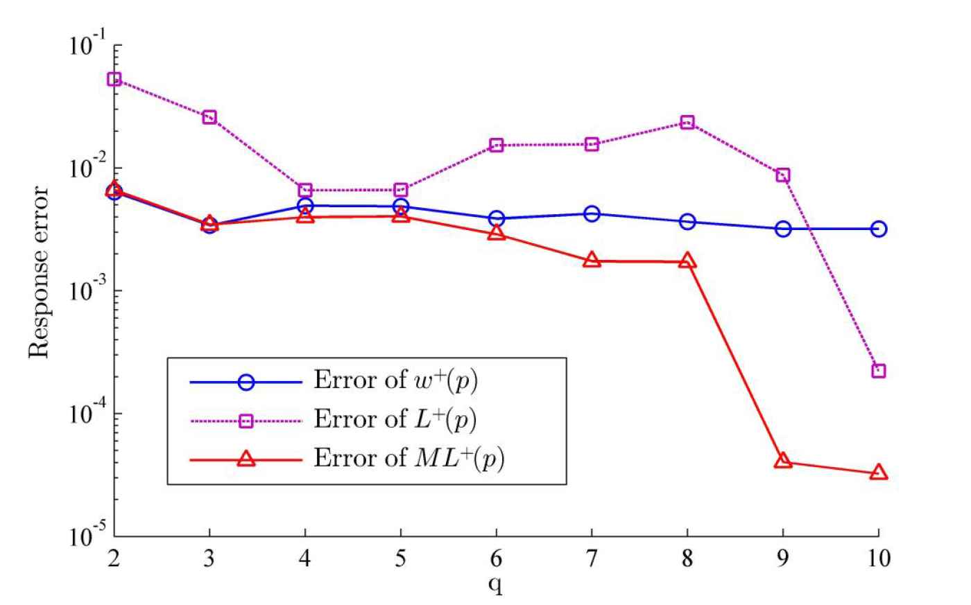 The response errors of the probability weighting function (PWF) for gains in semi-log scale. When increasing the number of the prospect (q), the error of analysis model w+(p) is decrease more slowly, than those of the numerical model L+(p) and the proposed novel PWF model ML+(p).