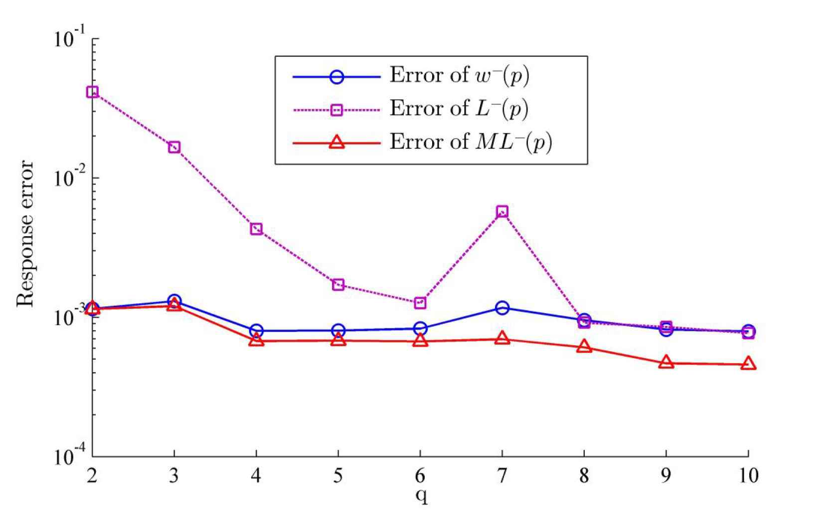 Not surprisingly, the response errors with each model tend to be smaller when the number q of the experimental preference points is larger. Indeed, more valid information brings more the high-quality experimental preference points and the lower the level of response errors. Moreover, the response error of Prelec's PWF wp has a small change with the increase of the experimental preference points' number q in Figures 10 and 11. However, when q is increasing, the response error of the numerical PWF model Lp and the novel PWF model MLp have a large decrease. Owing to the properties of Lagrange interpolation polynomial, the model Lp is not stable and it has a larger response error as the small number of the experimental preference points. So, the model Lp is modified for building the novel PWF model MLp. In Figures 10 and 11, the red line represents the response error of the novel PWF model MLp with known experimental preference points' number q. It possesses the advantages of both wp and Lp, so it can better reflect and predict the decision-makers' preferences than others.