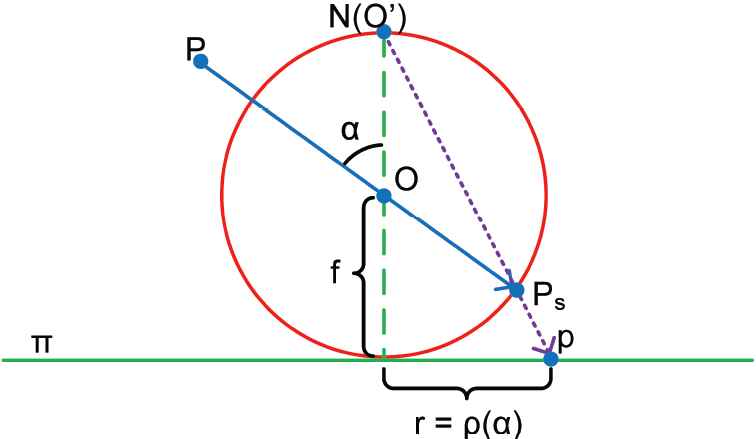 First, a 3D point P is projected perspectively through the center O onto point Ps on the sphere. Then Ps is projected to a 2D point p on the image plane π from another point O on the optical axis ON. The position of O along ON defines a series of projection models. Here O coincides with N in Figure 1. A projection model can be clearly represented as a mapping r=ρ(α), where α is the incident angle of ray emitted from P, and r is the radial distance as mentioned. The representative models below have been widely discussed: