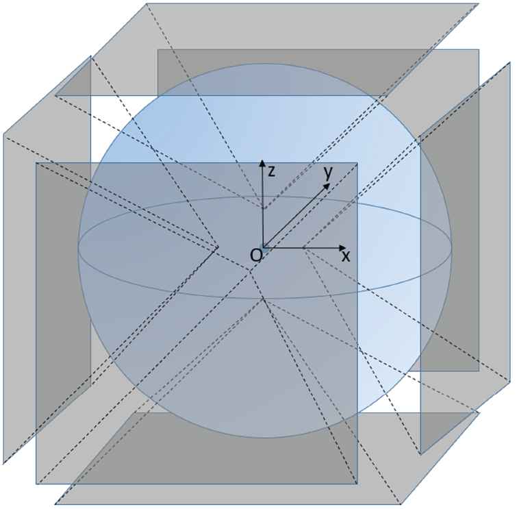 We define 6 identical pinhole cameras in the virtual scene, all positioned at the center of the viewing sphere. The cameras are arranged orthogonally. If the orientation of the fish-eye camera is (0, 0, 1), then the orientations of the 6 pinhole cameras are (0, 0, 1), (0, 0, −1), (0, 1, 0), (0, −1, 0), (1, 0, 0), (−1, 0, 0), respectively. The cameras all have an FOV of 90 degrees in both horizontal and vertical directions. The deployment of the cameras is shown in Figure 3.