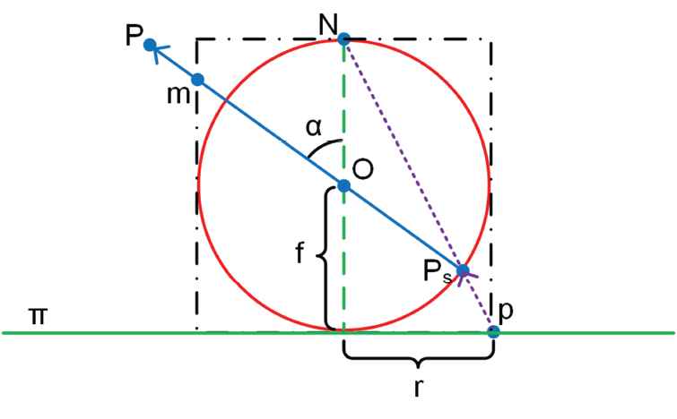 Note that the perspective projection can also be described by this procedure. In Ref. [23], the author prefers to stereographic projection rather than other alternative ones because it can represent a wider FOV while preserving a suitable range of shape properties of the projected objects, including the circularity, the local symmetry, the shape of small regions, and the angle at which two curves intersect. These properties are very useful in applications such as intelligent surveillance and automatic navigation. Thus, in this paper, the stereographic projection model is chosen for our estimation method. It is exactly the model shown in Figure 1.