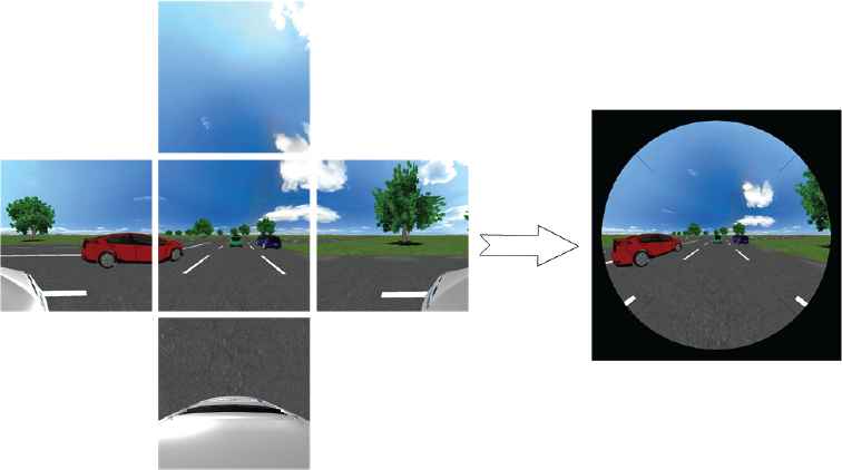 This creates a mapping between the simulated fish-eye camera and the five cameras. This mapping doesn't change from frame to frame in real-time rendering, thus can be stored in a mapping table. Each camera is assigned an ID, and for a pixel in the output image, its corresponding entry in the lookup table is like (ID,xm,ym). The pixel value can then be obtained from the position in the pointed image. The rendered outputs of the five cameras and the simulated ideal fish-eye image is given in Figure 5.