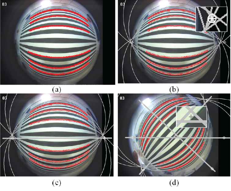 Estimation of the distortion center: (a) Points on the images of lines are extracted and grouped into several sets. (b) The fitting circles have many pairs of intersections, and the one with the lowest score is chosen as the initial position of the vanishing points. (c) The initial points are optimized and then linked. (d) At least three pairs of vanishing points need to be estimated to determine the distortion center.