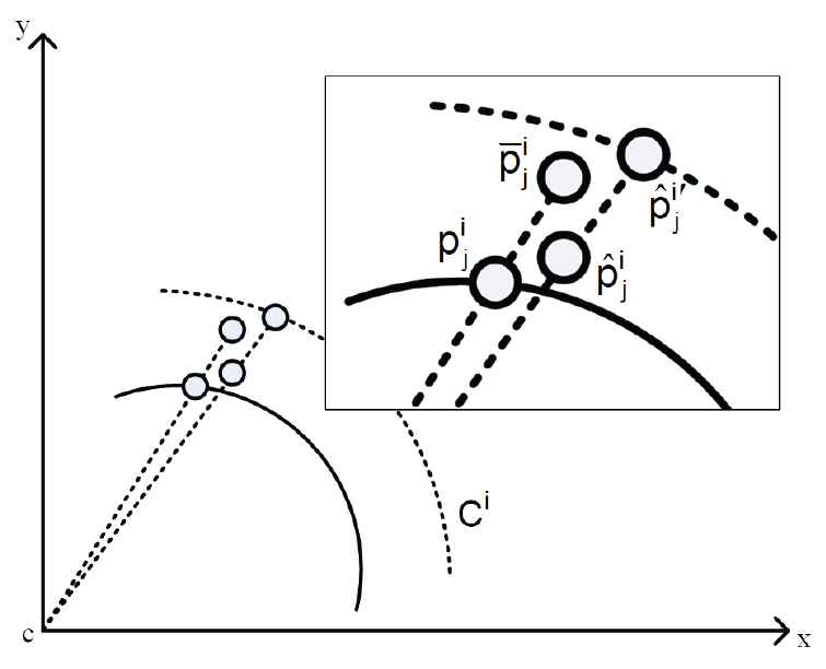 Measurement noise in the extracted points will be amplified nonlinearly due to the distortion if the objective function is defined in the space of the undistorted points [24]. Thus, in this paper, we define the object function in the space of distorted image points to ensure the robustness of the estimation method with the presence of noise. As shown in Figure 8, pji is one of the points in Ptar, p¯ji is the corresponding point in P¯tar, and Ci is the circle fitted to {p¯ji}j=1mi. We search for a point p̂ji near pji which, after being undistorted with λ̂, will lie exactly on Ci at p̂ji. Then the object function is defined as follows: