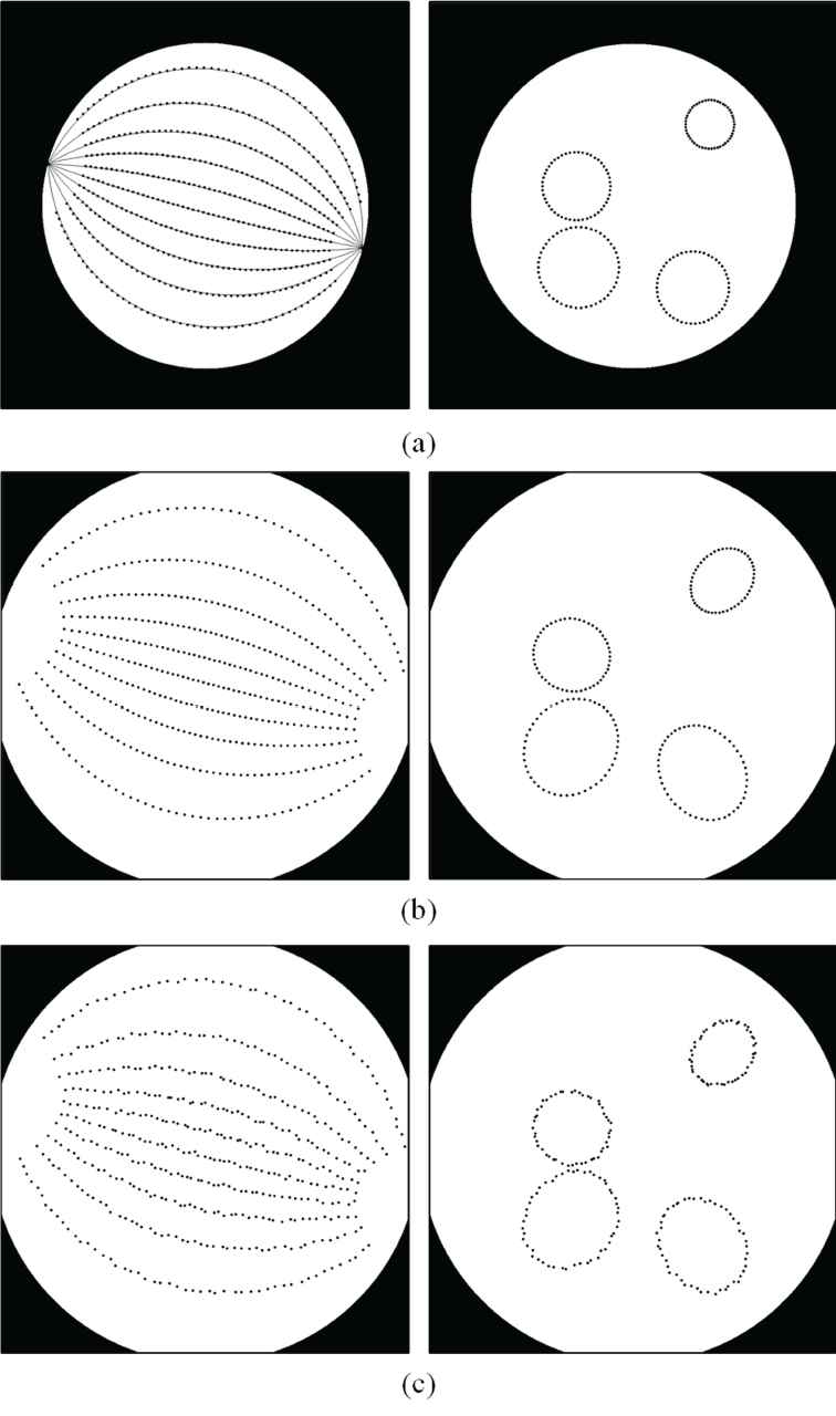 Next, PLG and PSG are distorted with known parameters to obtain PLD and PSD, as shown in Figure 9(b). Here, for simplicity, we let the distortion center coincide with the center of the image, i.e. [xc,yc]T=[0,0]T. Figure 9(c) shows that an independent, zero mean, zero-correlated, two-dimensional Gaussian noise is added to PLD and PSD. The points with noise are denoted as PLD and PSD.