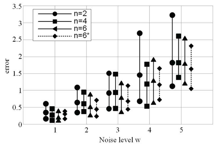 We vary the noise level w in increment of 1 pixel starting from 1 pixel, and vary the number of the targets n under different noise levels. For each (w,n) pair, the proposed method is performed on 100 random test sets. Figure 10 reports the inter-quartile range (IQR) of d when PSD is used as Ptar.