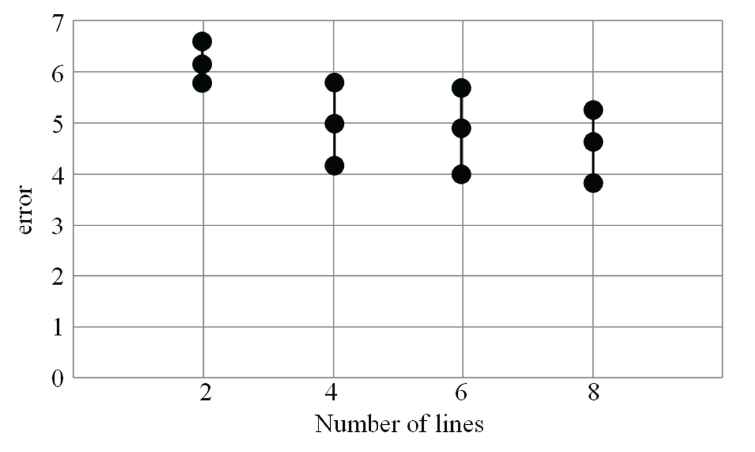 On the other hand, when a group of lines is used as the target, the result is not so good, as show in Figure 11. Even if the number of the lines increases, the improvement of the result is limited. The main reason for this is that the image of a space line under stereographic projection is only a portion of a circle, and circle fitting with points lying on a portion of a circle is an ill-conditioned problem. When a circle is fitted to these points, owing to the stronger fitting capacity of quadratics and the lack of geometric constraints, the objective function (19) has a great chance of reaching the minimum even if the undistorted points are very far from the ground truth. This will cause the iteration to converge to the wrong parameters. However, the image of a sphere is itself a complete circle; thus, the problem described above will not exist when spheres are used.