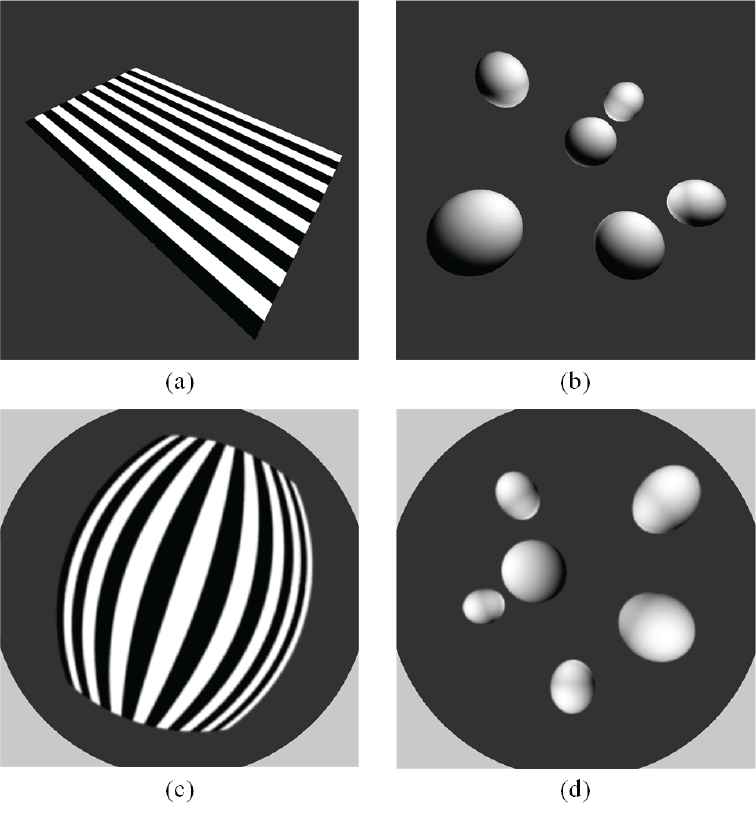 (a) and (b) Scenes containing a plane textured by black-and-white stripes and some spheres, respectively. (c) and (d) Distorted fish-eye images of (a) and (b), rendered by the modified OGRE engine.