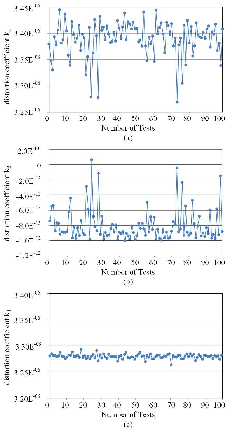 Scene 1 contains a plane target textured by some stripes to provide parallel lines. Scene 2 contains several identical spheres placed at random positions. We don't care about the interval between the lines and the size of the spheres. We have modified the engine to render blurry images. A Gaussian Blur with a radius of 2 pixels is applied here, and the coefficients k1 and k2 are set to 3E6 and 6E13, respectively. Three images of scene 1 and one image of scene 2 comprise a test set. The proposed method is performed 100 times on a single test set to investigate its stability. The estimated distortion center is c=0.047±0.89,0.036±0.88T, which is relatively stable. Figure 13 shows the results of the distortion coefficients.