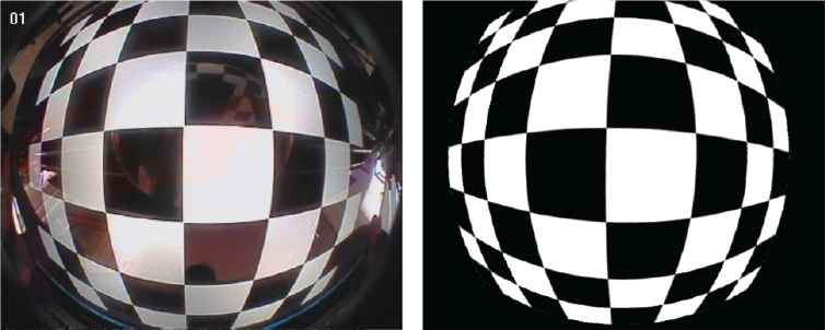 An image of a chessboard pattern captured by the real fish-eye camera and the corresponding simulated image.