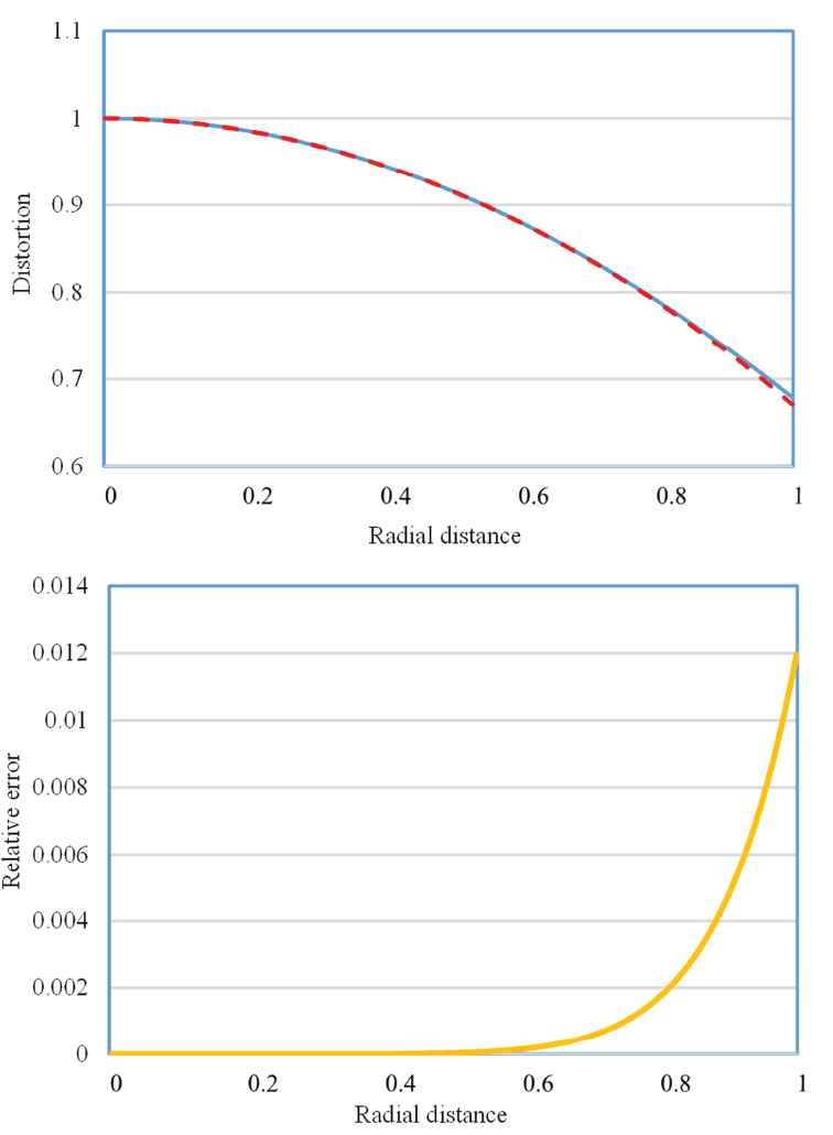 In addition to the projection model, imaging system design usually involves many other considerations, e.g., size, cost, and uniform illumination. Assembly defects are also introduced during camera manufacture. These will make the actual output of cameras deviates from the ideal projection model to varying degrees. This deviation is often treated as distortion. In classical camera calibration methods, the most commonly used distortion model is the Brown–Conrady polynomial model [21]:
