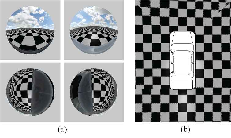 In this subsection, the practicality of our method is validated through an actual application of vehicle omniview system. In a common vehicle omniview system, there are often four fish-eye cameras mounted: one in the front of the vehicle, one in the back of the vehicle, one in the left outside mirror, and one in the right outside mirror. These four simulated fish-eye images are shown in Figure 17(a). The imaging system simulated above is used here. The ground is textured with chessboard pattern to clarify the result. The inverse perspective transformation is adopted to transform the image parts containing the ground into top views according to the parameters of the cameras. The top views are then fused into one single omniview image, as shown in Figure 17(b).