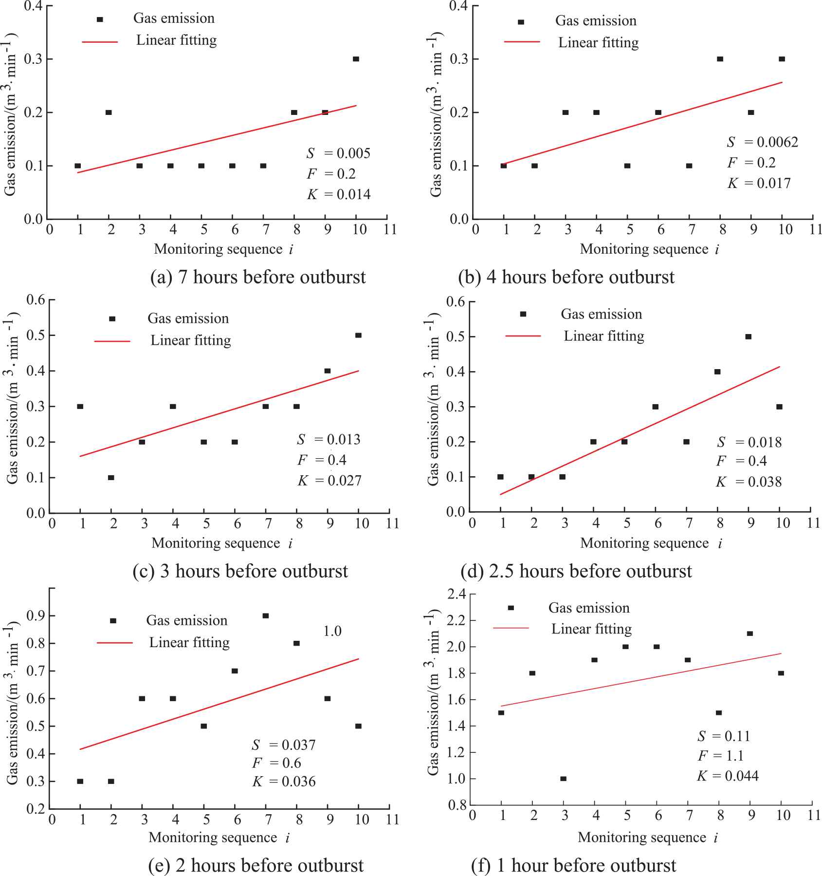 The fluctuation of the slope, K, indicates the direction and speed of the growth or decrease of the monitoring sequence. When K>0, it indicates that the sequence xt has an increasing trend, and the larger the K value, the faster the increase. Conversely, when K<0, it indicates that the sequence xt has a decreasing trend, and the smaller the K value, the faster the decrease. When K approaches zero, it indicates that the xt trend is relatively flat and there is no obvious increasing or decreasing trend. The monitoring sequence xt is linearly fitted and K is calculated. The larger the real-time monitoring |K| is compared with the normal sequence |K| indicates a trend toward coal and gas outburst. The formula is as follows: