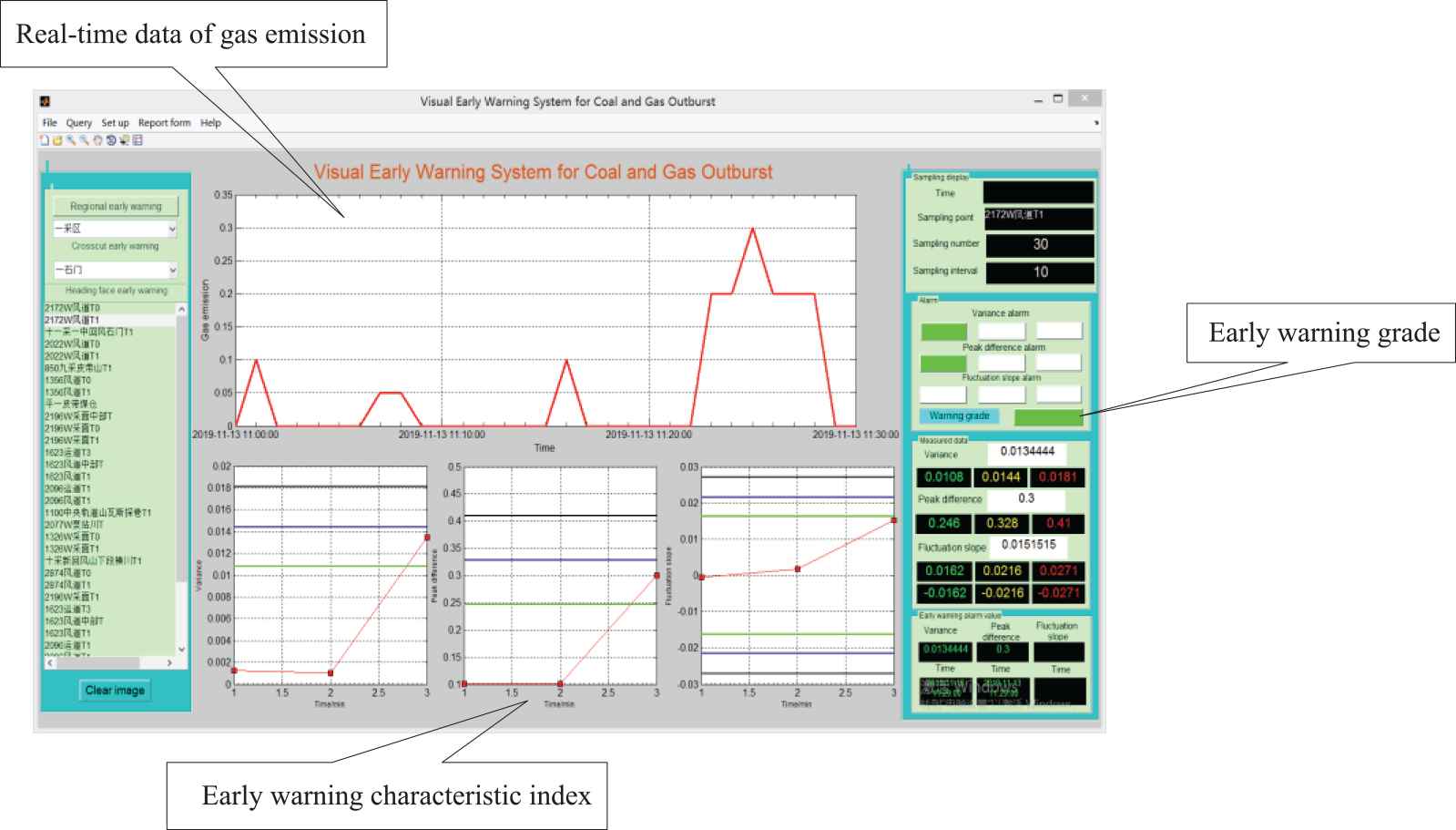4. Based on VB and MATLAB data analysis, a coal and gas outburst early warning system for Qianjiaying coal mine was compiled, including a real-time gas data acquisition system and a visual early warning system. The gas data real-time acquisition system can read gas monitoring data from a mine in real time, while the visual early warning system can monitor gas data for real-time early warning. Through the application in Qiangjiaying mine, a gas outburst was detected by the warning system, and an early warning was issued 6 hours before the accident.