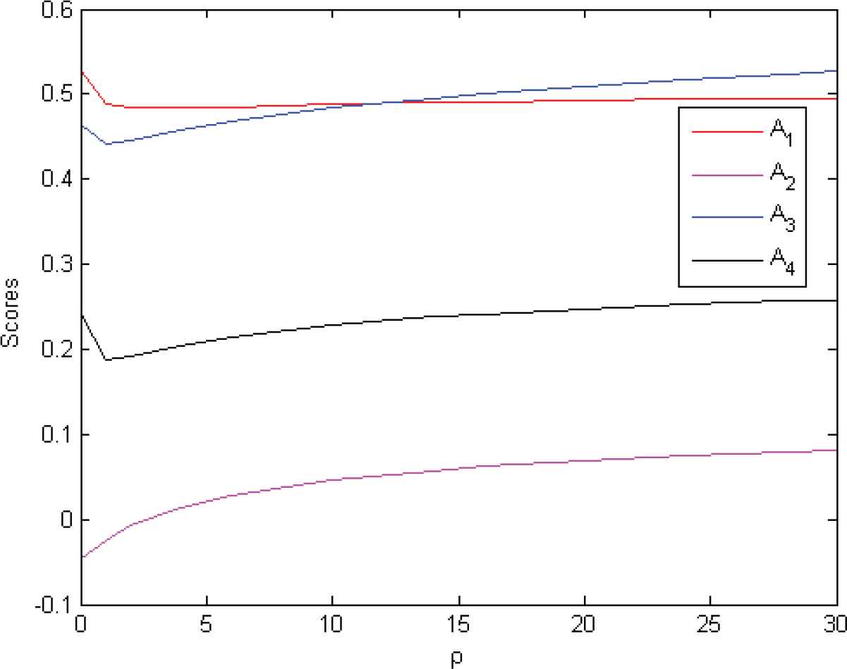 From Figure 1, we can obtain that the scores determined by the HPFIWA operator of alternative A3 first increases and then decreases as the value ρ increase,the reason is that the score function of alternative A3 is a monotone increasing function about parameter ρ in interval [0,0.4097] and a monotone decreasing function about parameter ρ in interval (0.4097,30], whereas the scores of other alternatives determined by the HPFIWA operator decrease as the value ρ increase. Since the parameter ρ is smaller, the score values of all alternatives are larger, then for an optimistic DM, smaller ρ is advised. Further analysis, we can get the following results: