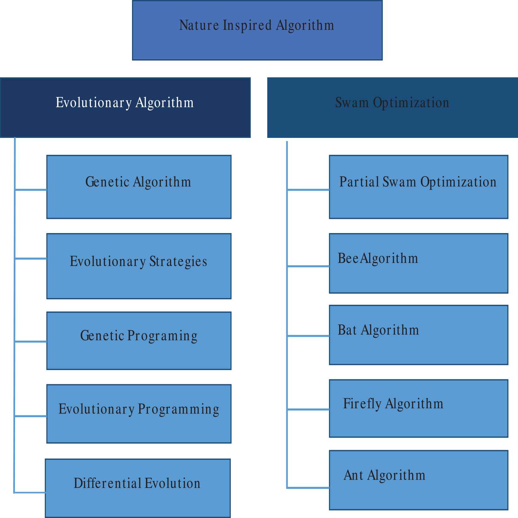 Since its inception in the late 1950s, evolutionary computing methods have received significant attention due to large domain applications [1925]. Until the present, evolutionary algorithms (EAs) under the umbrella of (evolutionary computation [EC]) have successfully and effectively tackled various test suites of benchmark functions and many real-world problems with a nonlinear, multi-modal, scalable objective, and constrained functions with complicated structures. Despite having the vast popularity of various nature-inspired and swarm-inspired EAs, still, we need to address their existing shortcomings to make them more advanced and effective by following the basic principles of rules of population evolution, procedures of self-organization and self-adaptation [26]. In general, nature-inspired-based algorithms can be categorized into EAs and swarm intelligence-based algorithms as shown in Figure 1. The EAs including the genetic algorithm (GA) [20,25,27,28], genetic programming (GP) [29], evolutionary strategies (ESs) [30,31], evolutionary programming (EP) [32] are classified as classical paradigms of EC and differential evolution (DE) [3336] and particle swam optimization (PSO) [37,38], ant colony optimization [39,40], artificial bee colony (ABC) [41,42], cuckoo search (CS) [43], bat algorithm (BA) [4446], Bee algorithm [47,48], and firefly algorithm (FA) [49] are new emerging population-based algorithms [50]. Despite many key features of the aforementioned EAs, they demand maximum function evaluations and spent huge computation time to solve optimization problems with complicated search space.