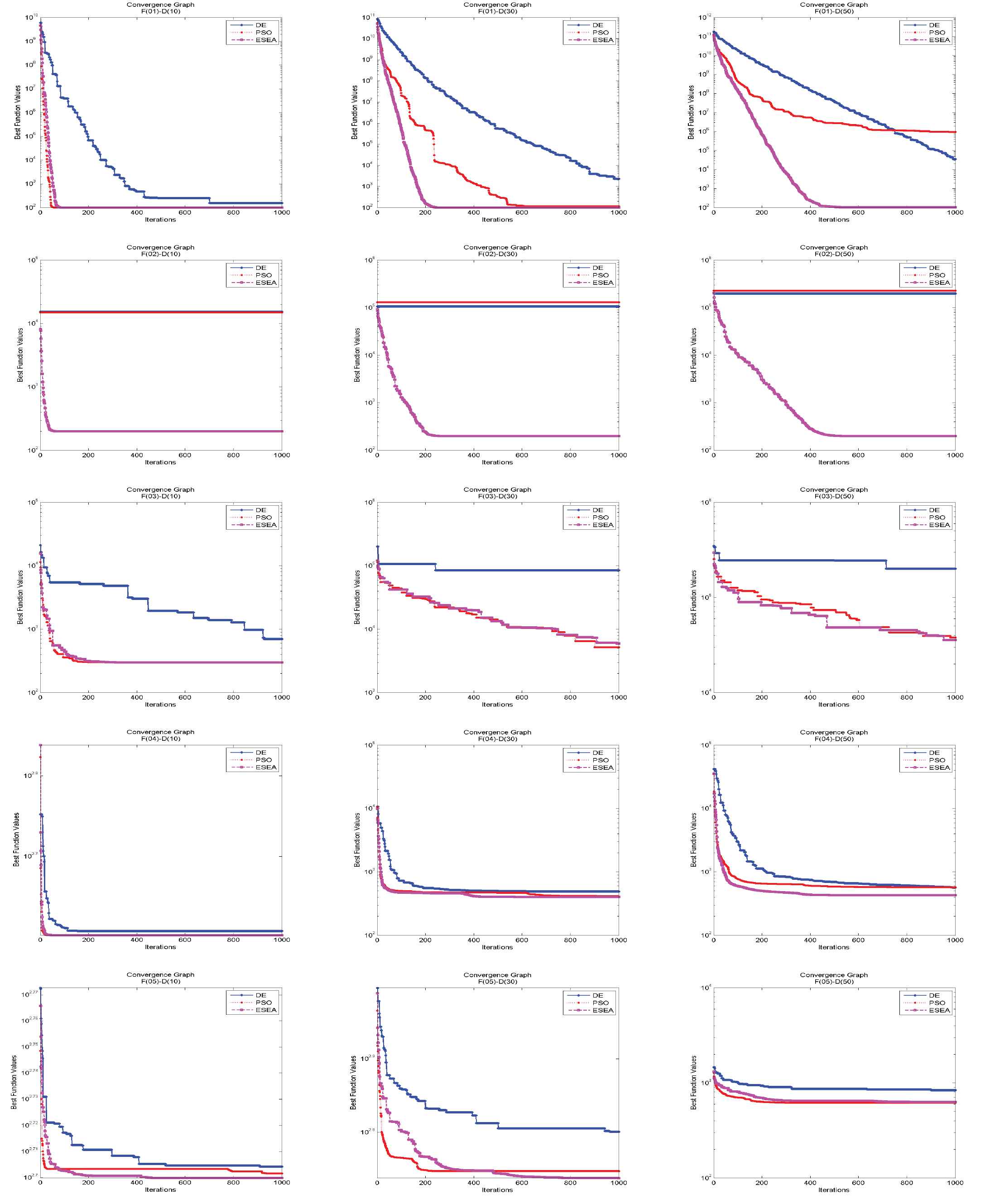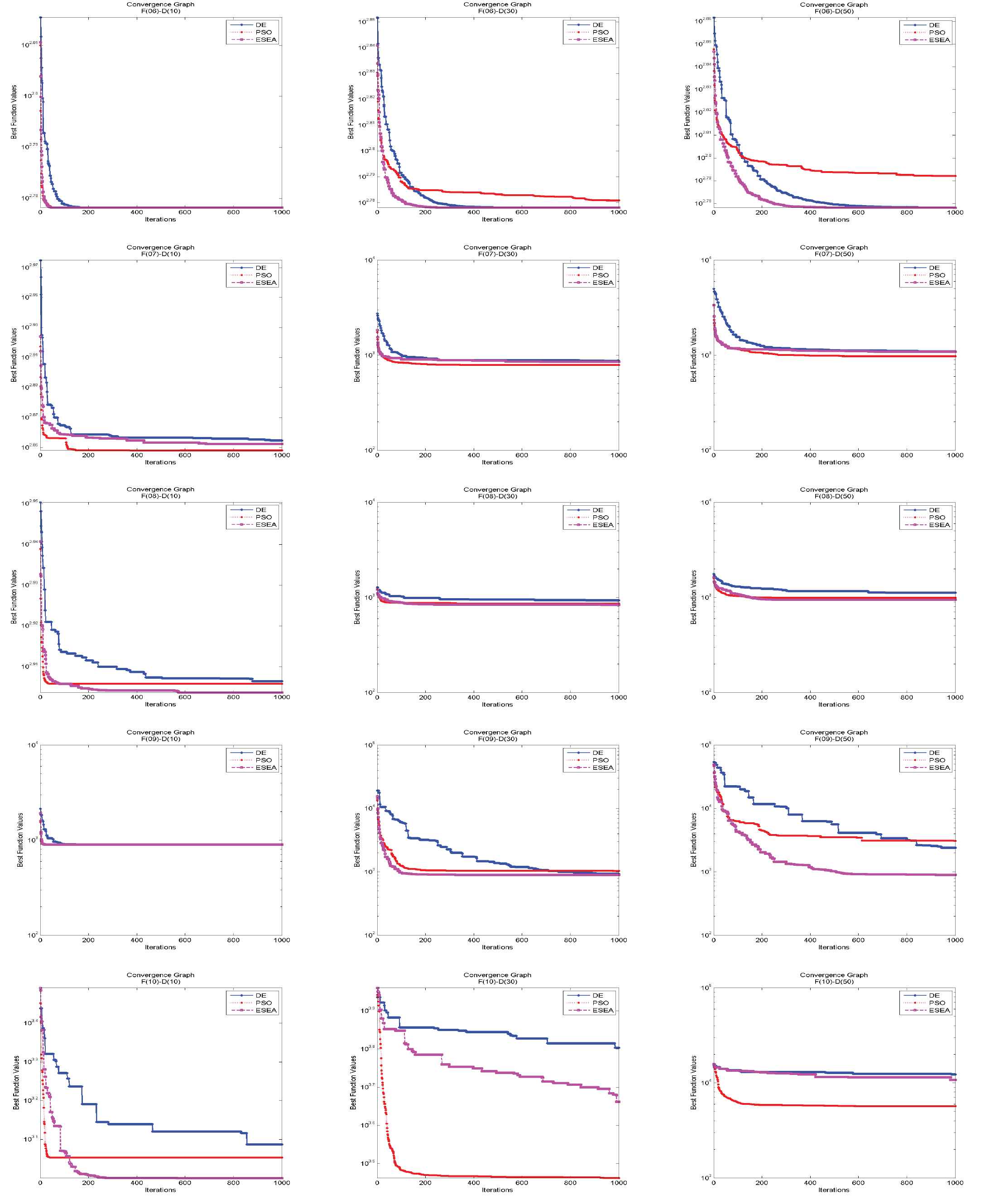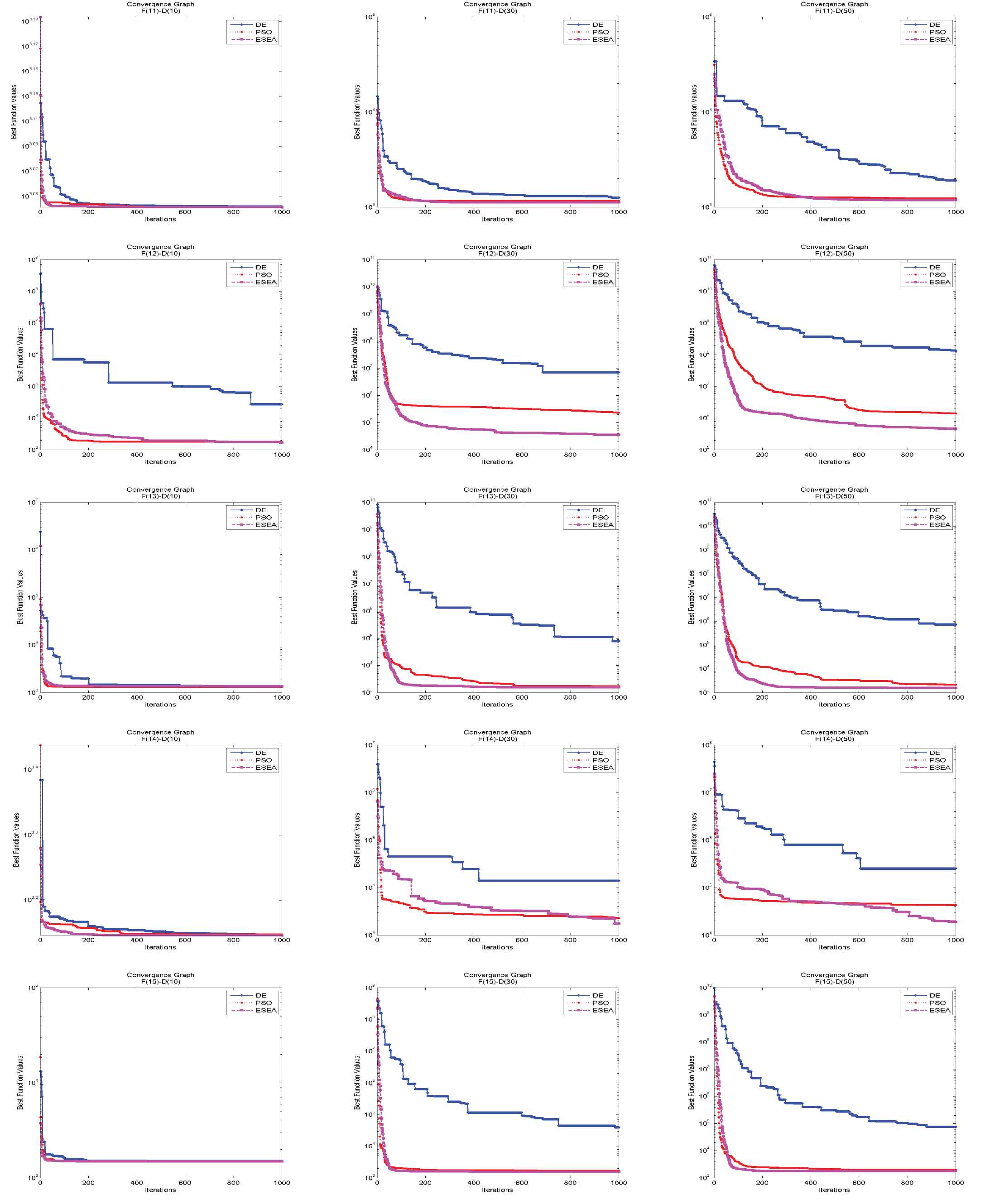 The evolutions in the minimum objective function values, when applying ESEA, PSO, and DE algorithms over benchmark function, F11 to F15 are given in Figure 4. The first panel is for n=10, the 2nd panel is for n=30, and the 3rd one is for n=50. These figures clearly exhibit that the convergence ability of the proposed ESEA algorithm is much better than PSO and DE algorithms while marching toward the known optimal value as listed in the last column of Table 1 as comprising the characteristics of F11 to F15 benchmark functions [63].