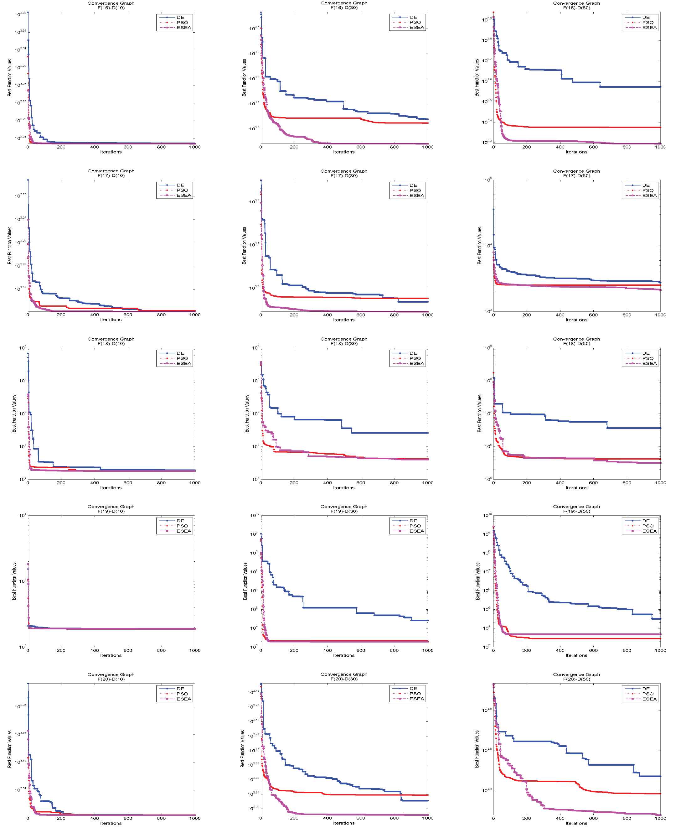 The convergence graphs displayed by ESEA, PSO, and DE algorithm by solving benchmark functions likewise F16 to F20 in different dimensions are given in Figure 5. The first panel is with respect to dimension n=10, the 2nd panel is with respect to n=30, and the 3rd one is with respect to n=50. These figures, clearly exhibit that the convergence ability of the proposed ESEA algorithm is much better than PSO and DE algorithm in term of converging toward the known optimal value as listed in the last column of Table 1 that mainly describe the key features of F16 to F20 benchmark functions [63].