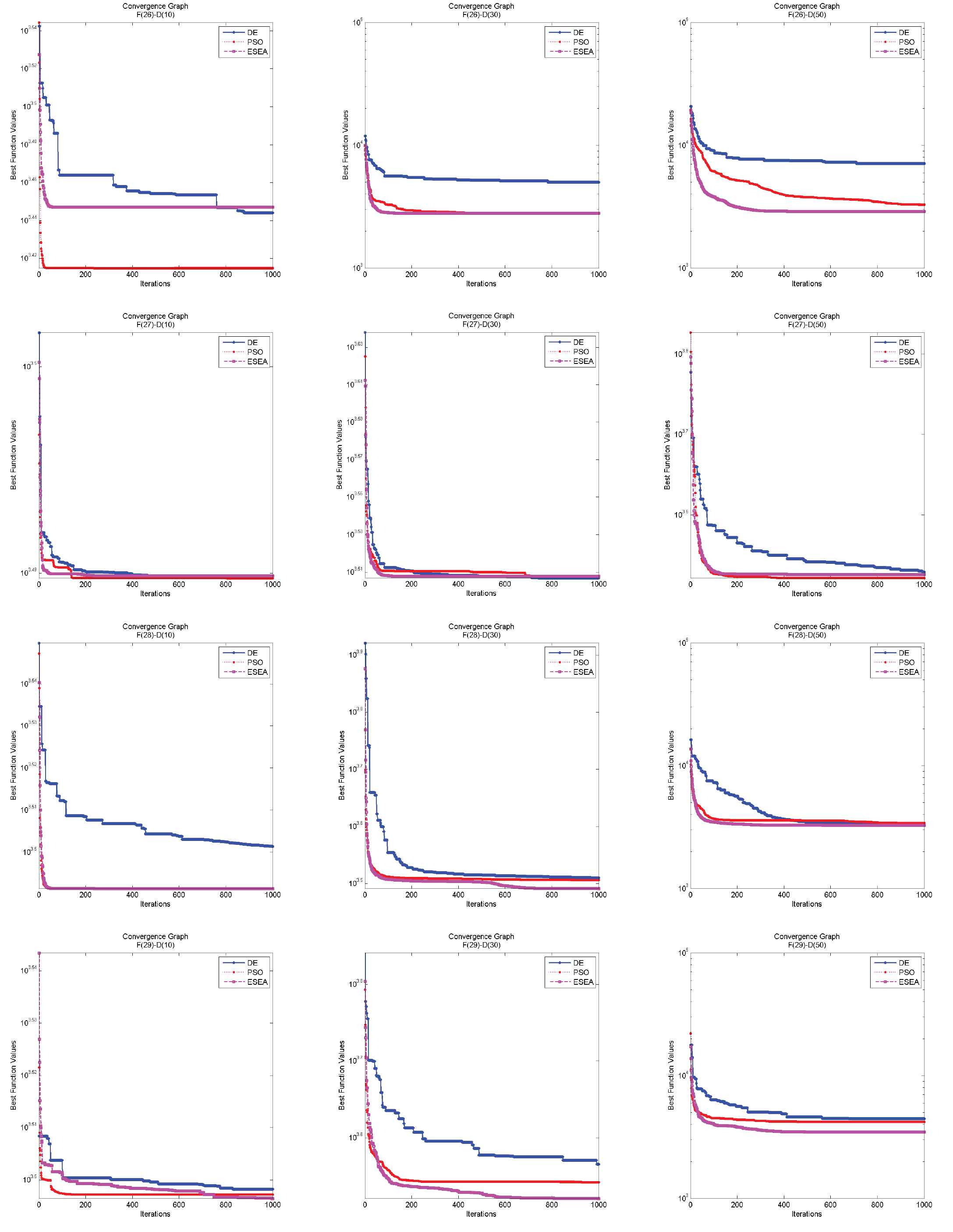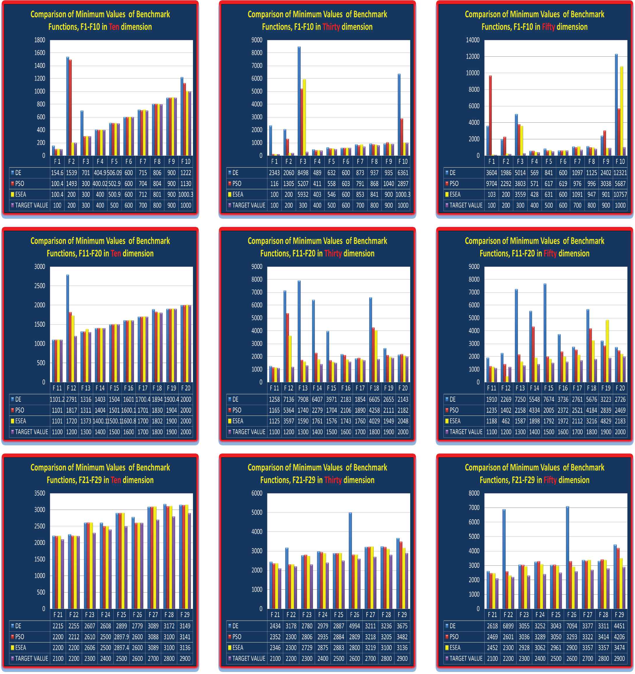 Figure 9 presents comparison of best function values versus optimal values of benchmark functions F1 to F29 in n=10, 30, and 50 dimensions which are solved by DE, PSO, and ESEA. The 1st panel is designated for the mentioned problem with ten dimension, 2nd panel attributes problems with thirty dimension, and 3rd panel deal with problems with fifty dimension.