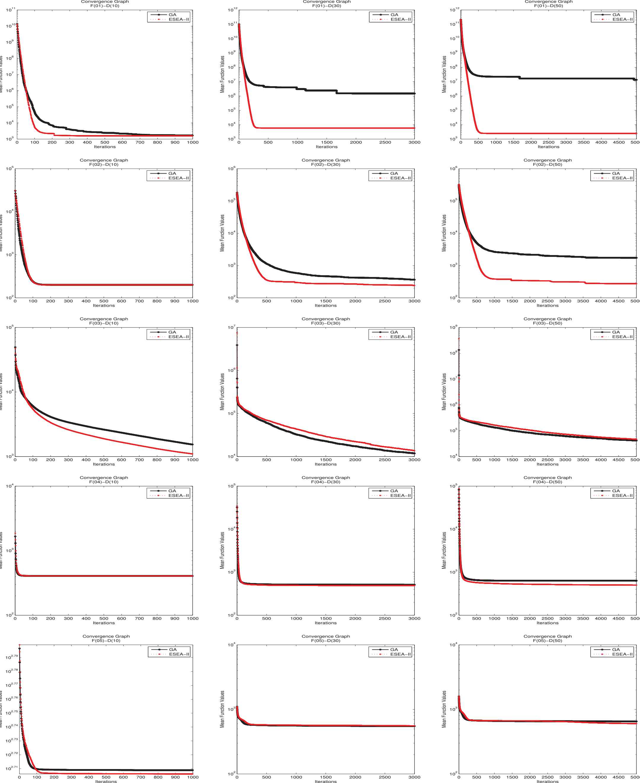 In Figure 8, the evolution in the average objective function value displayed by ESEA-II versus GA while solving benchmark functions denoted by F1 to F5. The 1st panel in the 8 for F1 to F5 in ten dimension, 2nd panel by solving F1 to F5 in thirty dimension, and 3rd panel is for the same functions in fifty dimension.
