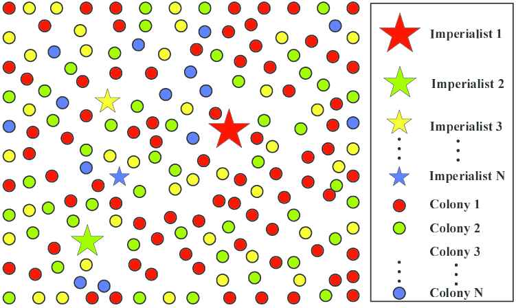 is the normalized power of an imperialist and cn is the cost of n-th imperialist. Then, NCn colonies are chosen randomly and assigned to n-th imperialist. These colonies together with the imperialist make up the n-th empire. From the mechanism of colony division, stronger empires have larger number of colonies while weaker ones have less. Figure 1 shows the initial population of each empire.