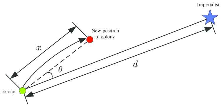 where d is the distance between imperialist and colony, β is a number greater than 1. To enlarge the search range around the imperialist, a deviation angle is added to the direction of movement, θ represents this deviation in Figure 2. Similarly, θ is a uniformly distributed random number as