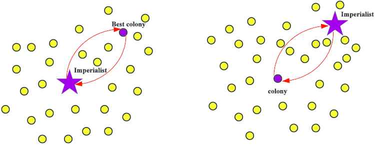 After movement, the cost of a colony maybe better than that of its relevant imperialist. If this case occurs, the imperialist and the colony exchange their positions, see Figure 3. That is to say, the colony become imperialist and the old imperialist become a colony. Then, the algorithm will continue by the new imperialist and then colonies start moving toward this position.
