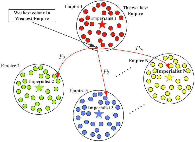 Once the assimilation process finished, the imperialistic competition takes place between empires, as shown in Figure 4. The purpose of competition is to increase the power of more powerful empires and decrease the power of weaker ones. To do this, one or more the weakest colonies of the weakest empires is picked up and all empires compete to possess these (this) colonies. Each empire has chance to possess the colonies according to its total power. The probability of each empire possessing the colonies is defined as