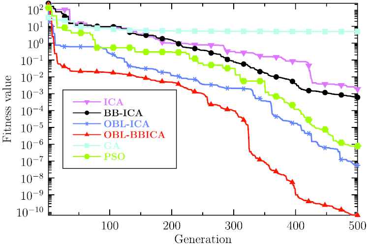 Evolution curve of each algorithm for identifying fractional Volta system.
