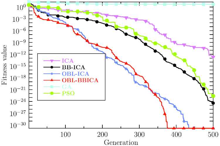 is considered, where a,b,c and q are unknown parameters. The true parameters of system (29) is set to (a,b,c)=(19,11,0.73) and q=0.99. G-L definition is used to solve the system to obtain the original state vector sequence Xk. The chaotic behavior of the fractional Volta system is shown in Figure 7. The lower and upper limits of each parameters are set as 15a24, 8b15, 0.5c0.9 and 0.5q1.2. Also, the ICA, BBICA, OBL-ICA, OBL-BBICA, GA and PSO all independently run 30 times, and the identification result are statistically listed in Table 2 in terms of the best, the worst and the mean. It can be seen from Table 2 that the identification result of the proposed OBL-BBICA is the best in that the best, the worst and the mean all reaches the true value. It implies that the identified parameter values of OBL-BBICA are the same as the true parameter value in each run. The evolution curve of each algorithm is shown in Figure 8. It is obvious that the proposed OBL-BBICA converges faster. This further verifies the effectiveness of the proposed method.
