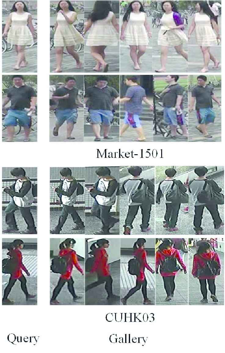 Several person images in the two benchmarks. The first column is four query person images. The second to fifth columns correspond to their retrieved images, respectively.