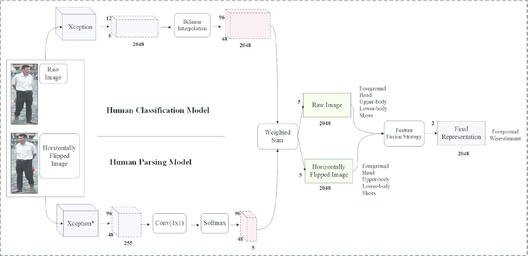 In this work, Xception [22] is adopted as a backbone architecture, which is used for both human parsing and human classification models. Hence, we first make a simple introduction to Xception architecture. Subsequently, we describe our human classification and human parsing model in detail. Finally, just like reference [21], we give some details about how to combine the human parsing model with human classification model, which generates our proposed final person reidentification architecture.