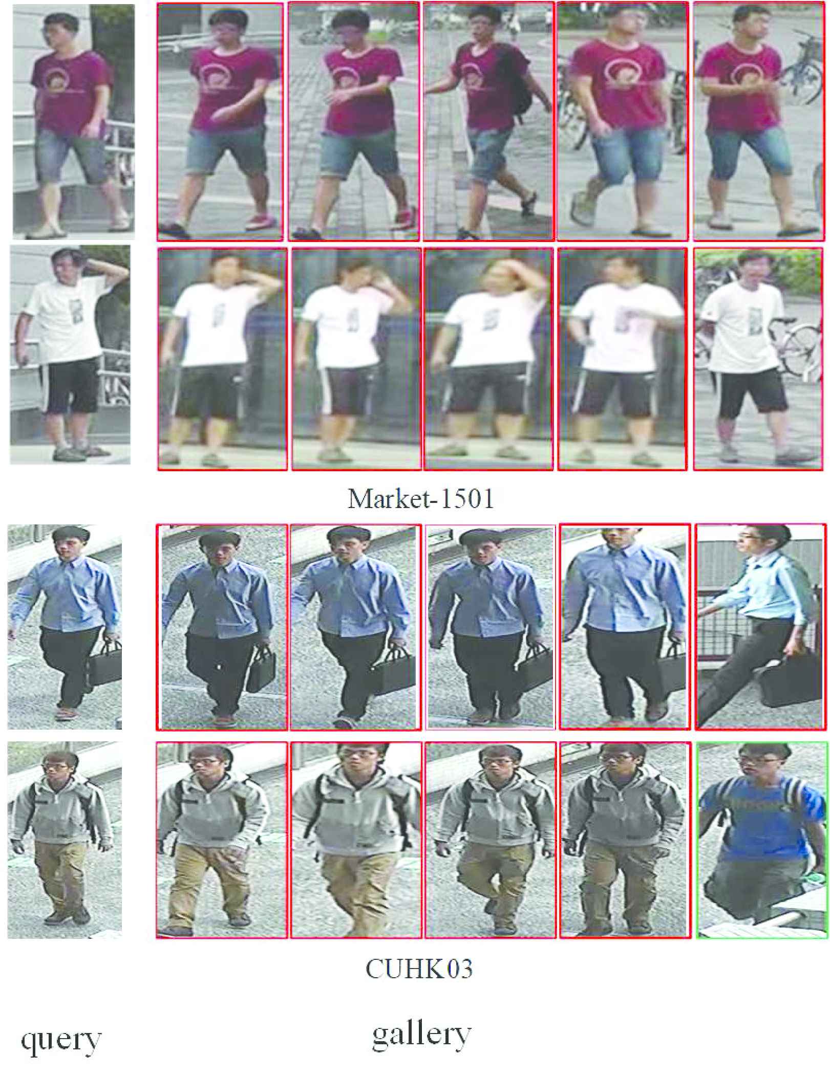In the Figure 4, we show the top-5 retrieve results achieved by the BMPP architecture. From Figure 4, we list four person images from query set on Market-1501 and CUHK03. The images from gallery set are retrieved given a query image. As shown in Figure 4, the red rectangle represents the correct retrieved image. On the contrary, the green rectangle represents the incorrect matching image. The top-5 retrieve results for the two person images from Market-1501 are all correct. However, there is a matching error for one person images from CUHK03. From the picture content, they may have great similarity in appearance, which makes the BMPP to mismatch images of different pedestrians.