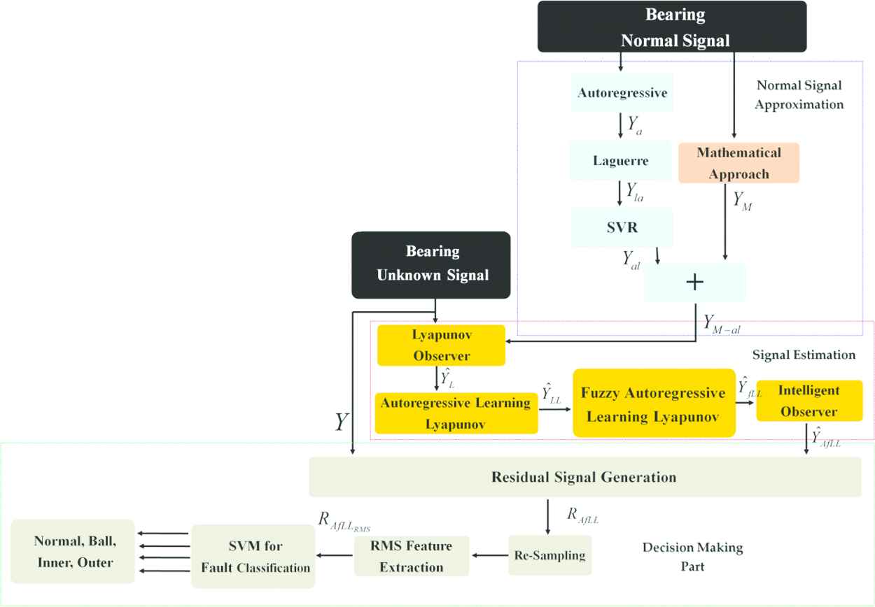 The combination of mathematical-based vibration signal modeling and autoregressive learning techniques for vibration signal approximation, the adaptive fuzzy autoregressive learning Lyapunov scheme for signal estimation, and SVM for classification of bearing fault in one frame.