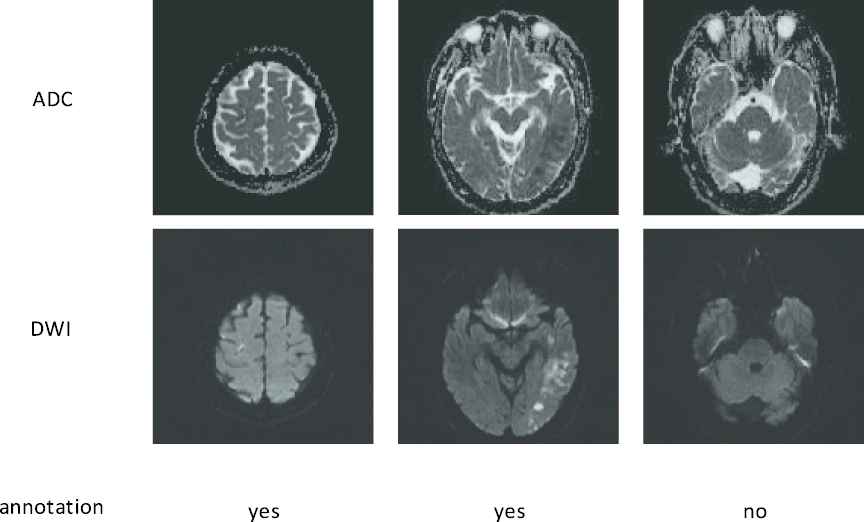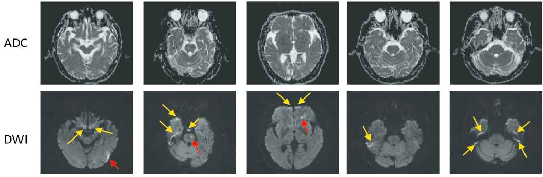 In diagnosing of ischemic strokes, magnetic resonance imaging (MRI) serves as the modality of choice for clinical evaluation. The diffusion-weighted images (DWIs) and the apparent diffusion coefficient (ADC) maps derived from multiple DWIs with different b-values have been shown to be sensitive in diagnosing acute ischemic stroke (AIS). In particular, the AIS lesions appear as hyperintense on the DWIs and hypointense on the ADC maps [3]. Figure 1 presents some examples of AIS lesions. The regions identified by the red arrows are AIS lesions. The regions identified by the yellow arrows, although also shown as hyperintense on the DWIs, are non-lesion regions. In fact, such hyperintensive regions are the magnetic susceptibility artifacts. That is to say, despite that they appear as hyperintense on the DWIs, there is no abnormality on the ADC maps. Therefore, to correctly identify the lesions, it is important to jointly consider both DWIs and ADC maps to extract the semantic information.