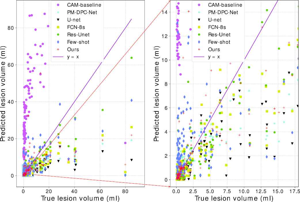 Figure 7 further plots the scatter map between the volumes of the ground truth and the predicted segmentation, where the purple line indicates a perfect match between the predicted volumes and the ground truth volumes. As the Figure 7 shows, the predicted volumes of our proposed method are closer to the true volumes than the competitors.
